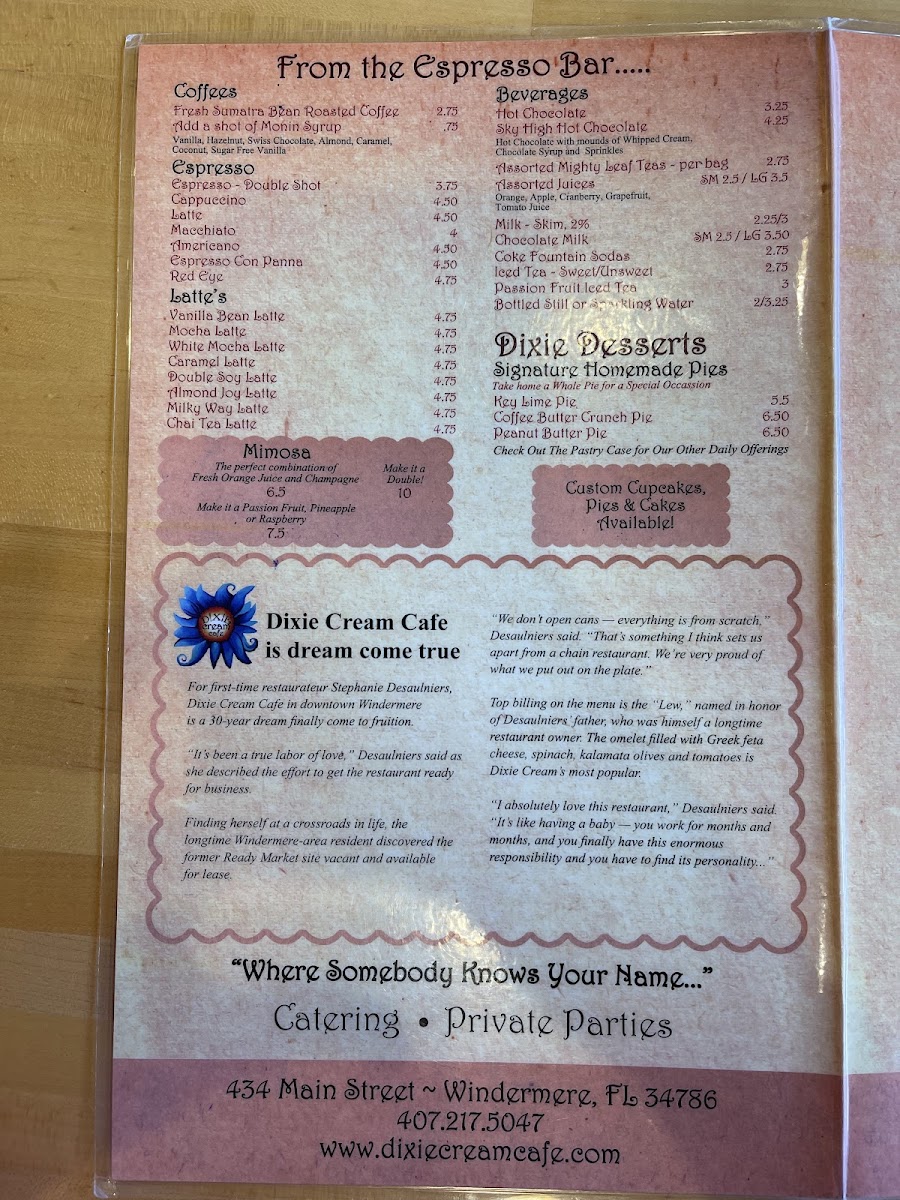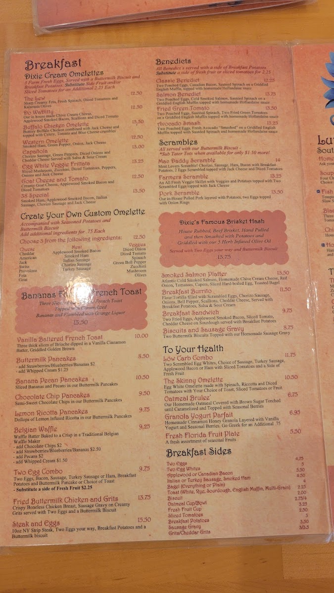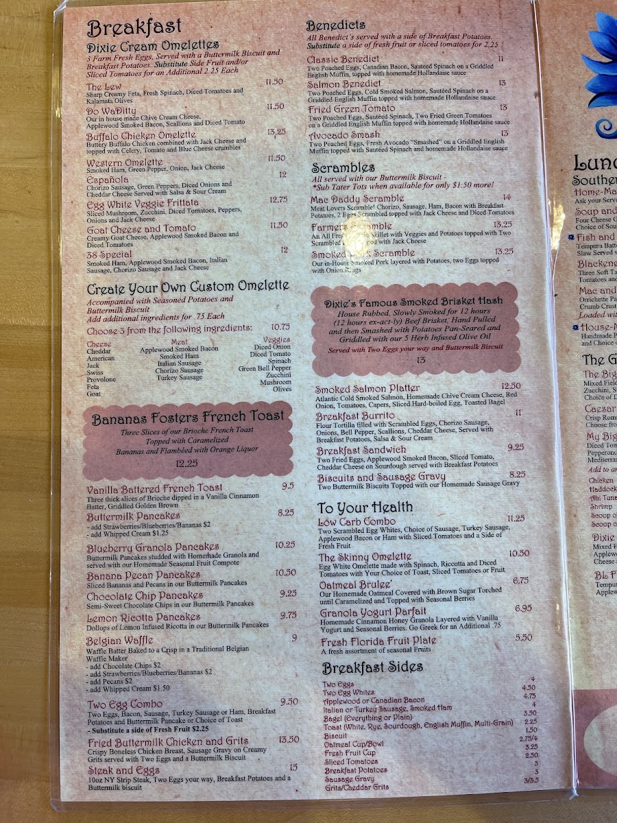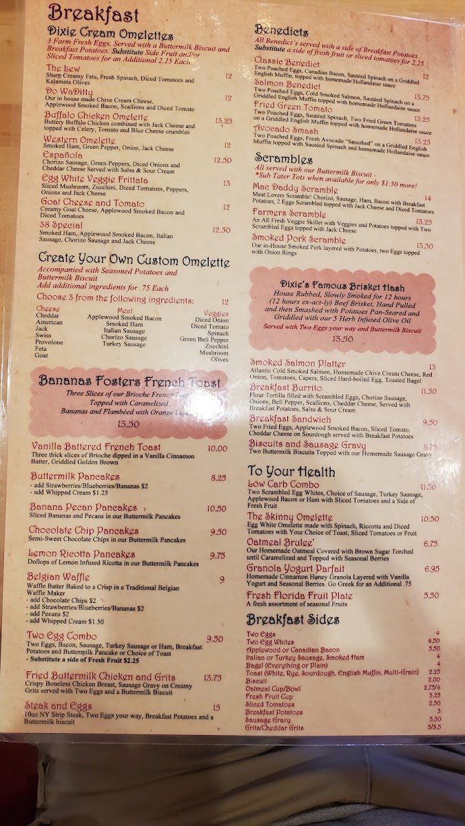The menu at Dixie Cream Cafe offers a straightforward, comforting selection that feels right at home in a casual breakfast spot. Here, you’ll find classic breakfast dishes alongside hearty café staples, perfect for starting the day or enjoying a relaxed brunch. Options like the Brisket Hash and Two Egg Combo showcase familiar favorites, while items such as the Bananas Fosters French Toast or Fried Buttermilk Chicken and Grits bring a bit of southern warmth and richness to the table.